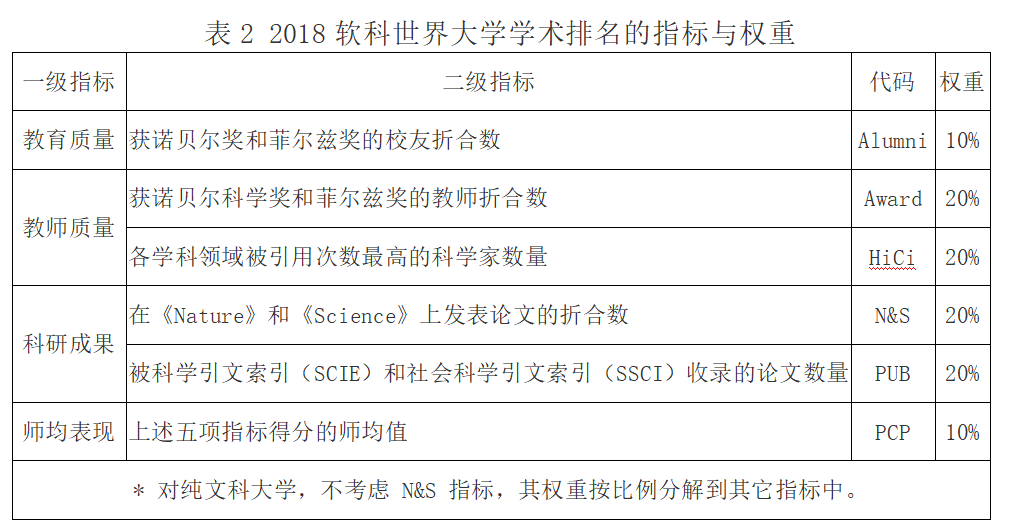 软科世界大学学术排名2003年由上海交通大学世界一流大学研究中心首次发布,是世界范围内首个综合性的全球大学排名。2009年开始,此排名改由软科发布并保留所有权。软科世界大学学术排名以评价方法的客观、透明和稳定著称,全部采用国际可比的客观指标和第三方数据,具体指标体系见下表: