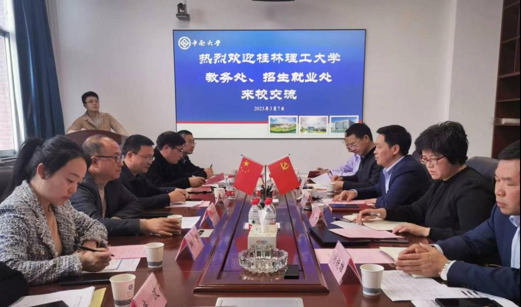 2023年3月7日下午,桂林理工大学教务处游少鸿处长、招生就业处迟国东处长一行7人来校调研教学管理经验、实习基地建设、人才培养和专业建设、本科招生就业等内容。我校本科生院院长何旭辉、副院长张柯、副院长邹金锋、本科生招生办公室主任刘铁雄,就业指导中心副主任陈晚云以及本科生院相关科室负责老师出席会议。会议由张柯副院长主持。